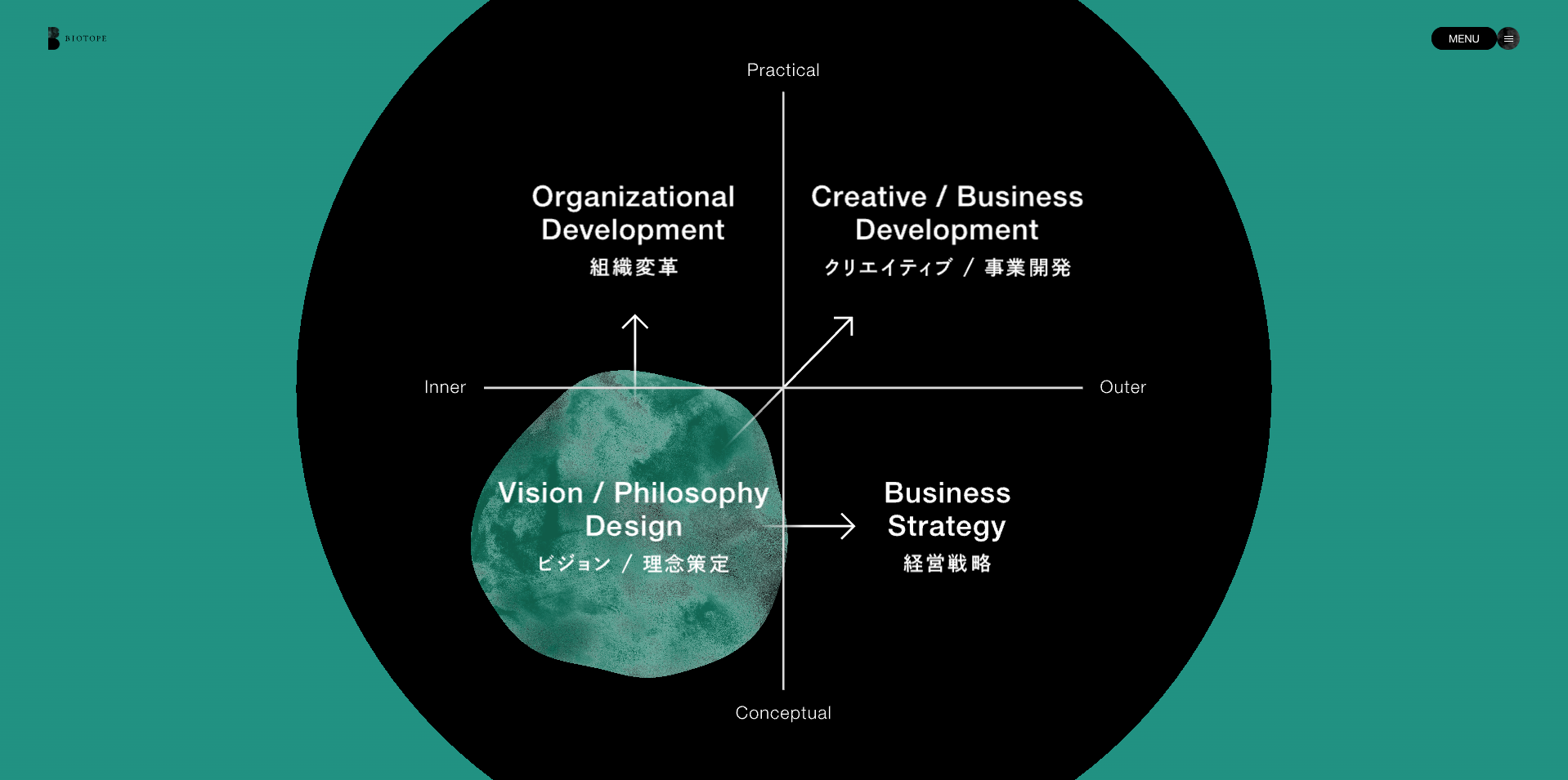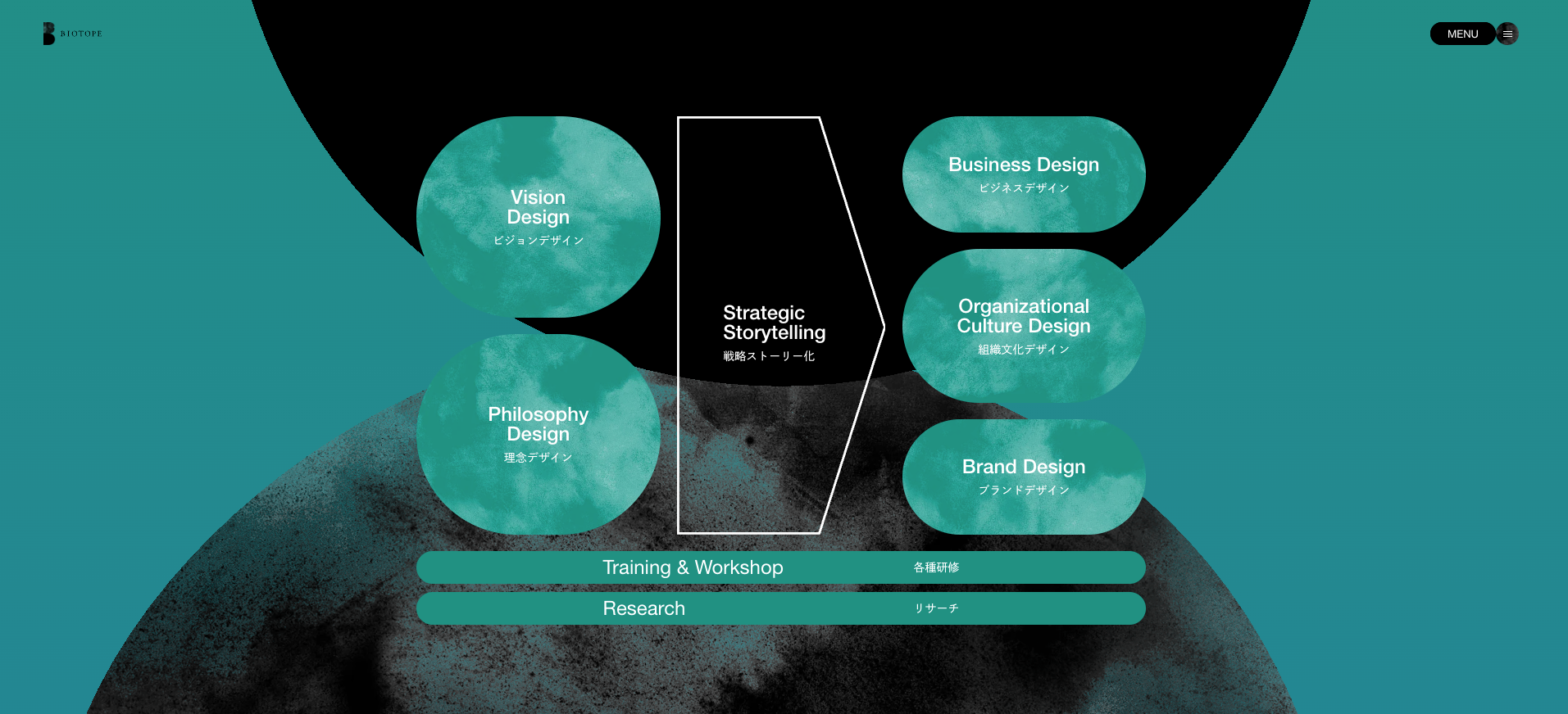 また、BIOTOPEが提供するサービス体系を図式化し、ビジョン・理念デザインを起点に、経営戦略、組織変革、ブランド・クリエイティブ・新規事業開発へと展開する流れを可視化しました。