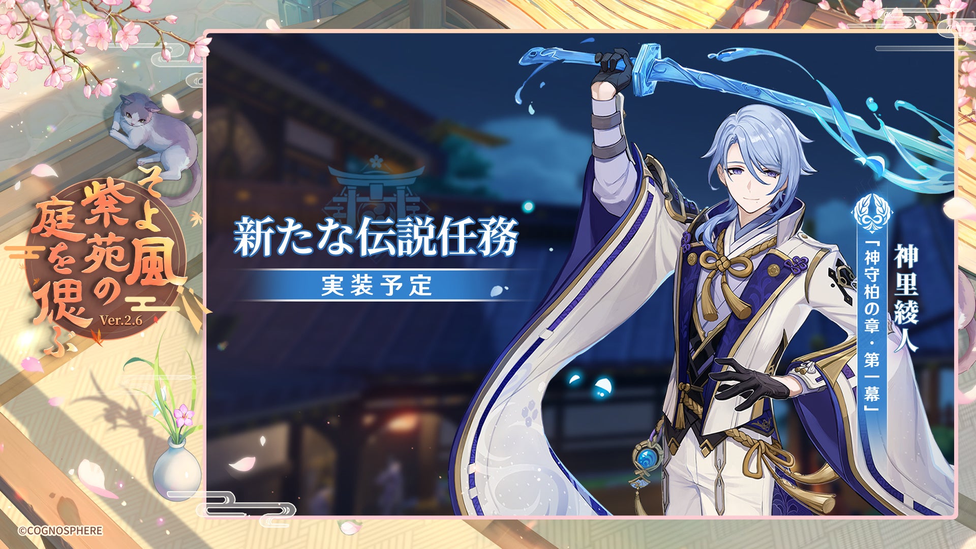 株式会社COGNOSPHERE(本社:東京都渋谷区、代表取締役社長:李 承天)は、HoYoverseが配信するマルチプラットフォーム対応オープンワールドRPG『原神(げんしん)』のVer.2.6「そよ風、紫苑の庭を偲ぶ」のアップデートを3月30日(水)に実施することを発表いたしました。新★5キャラクター「神里綾人」の登場や、実施予定のイベント情報などを一部公開いたします。