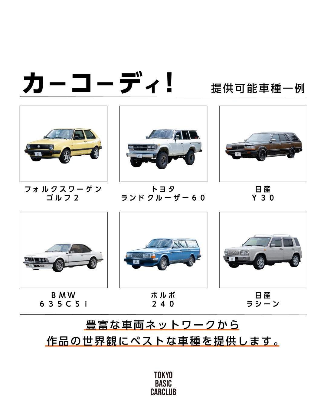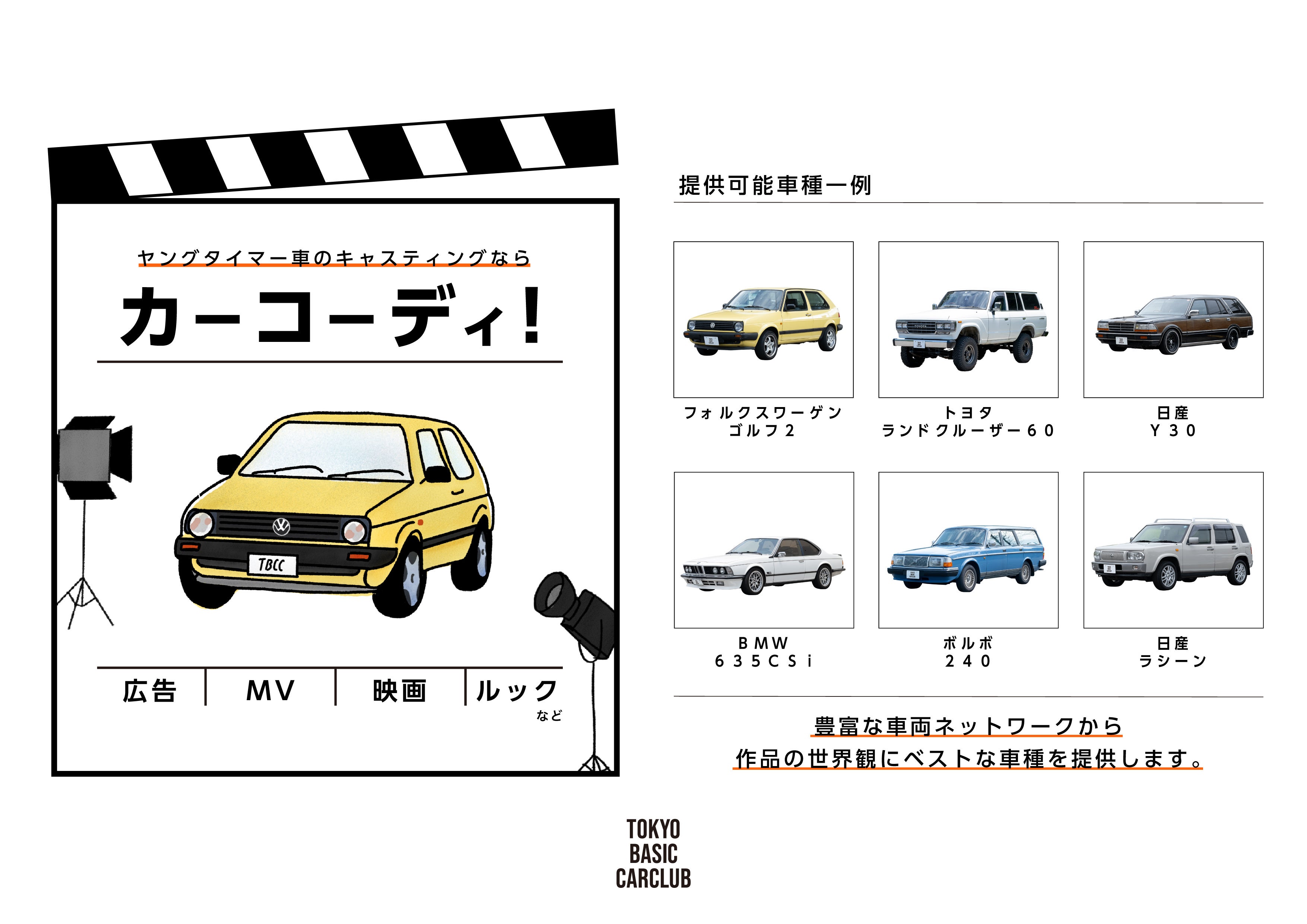 ヤングタイマー車に特化した、広告、MV、映画等への車両提供サービスです。