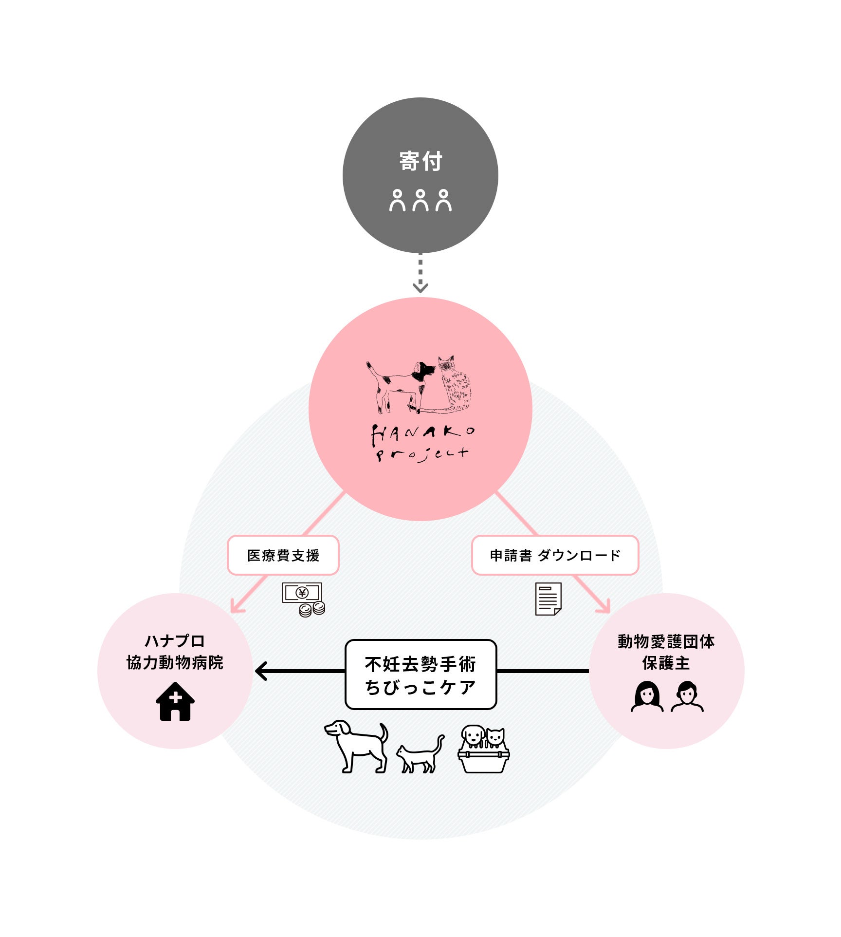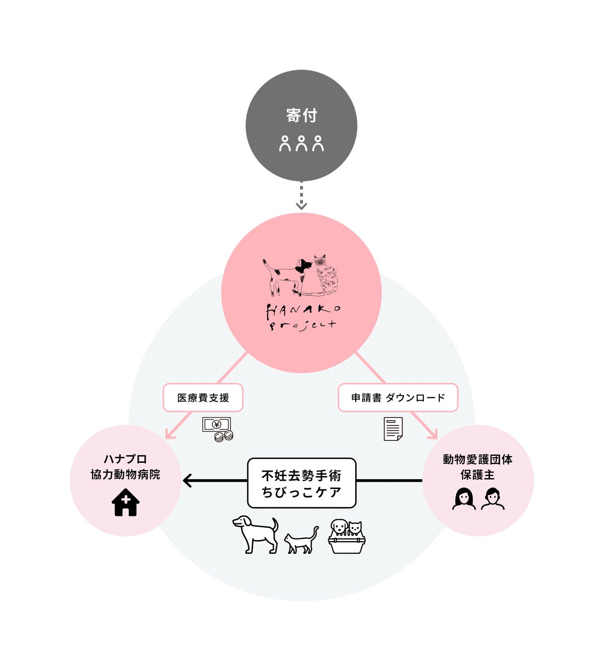 ハナコプロジェクトとして寄付を集め、それを使って、協力してくれる動物病院(=ハナコプロジェクト協力病院)にて、保護犬猫が医療を受けられるしくみです。(ご利用には条件があります)