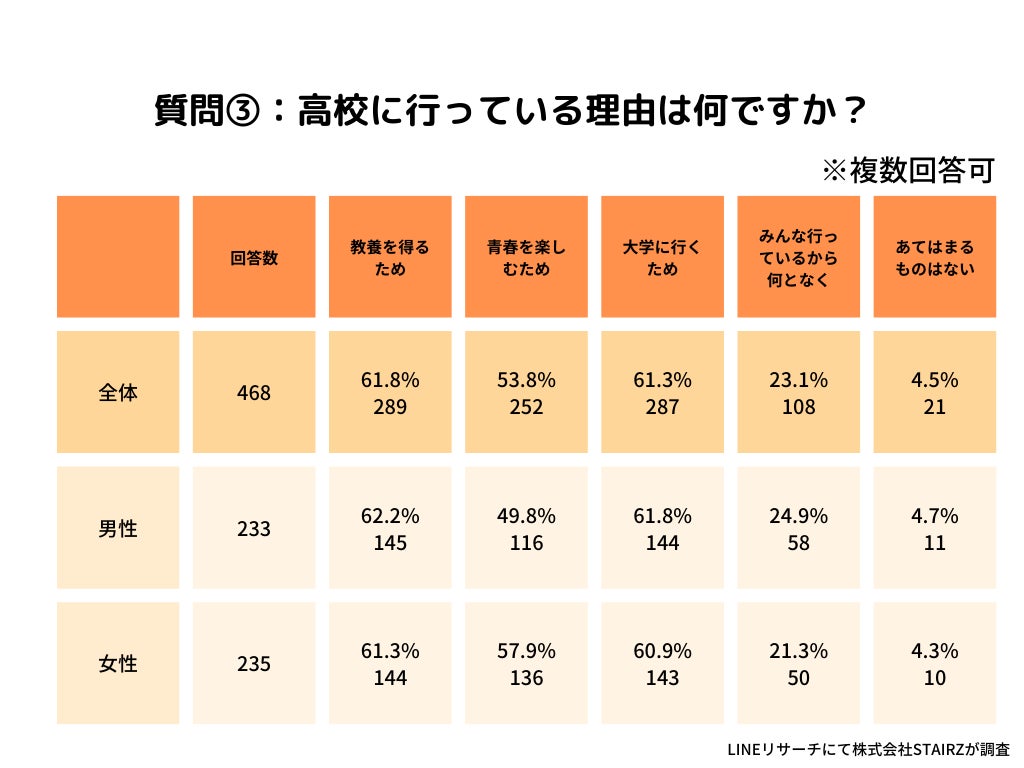高校に行く理由と楽しいかどうかは、必ずしも同じではないということがわかります。