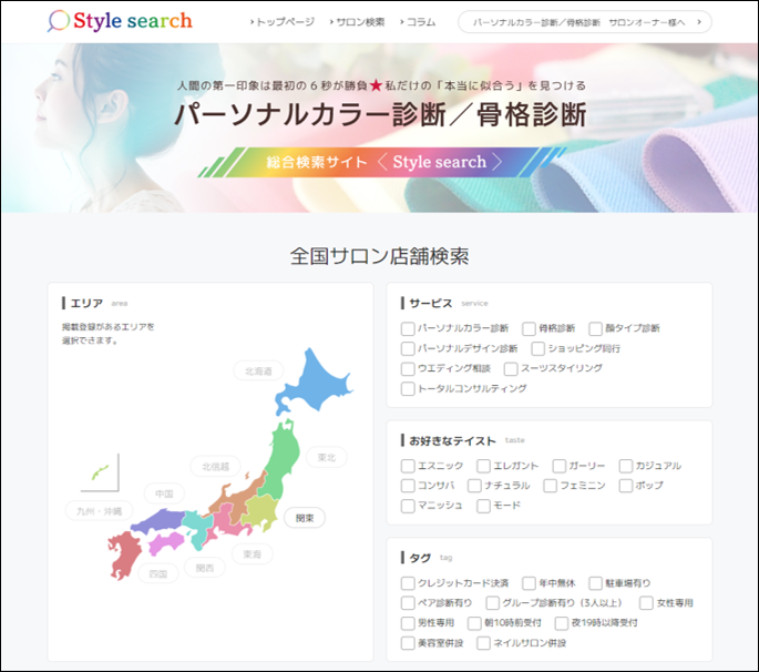Style searchはパーソナルカラー診断や骨格診断を受けることのできる、イメージコンサルティングサロンを検索し予約できるサイトです。