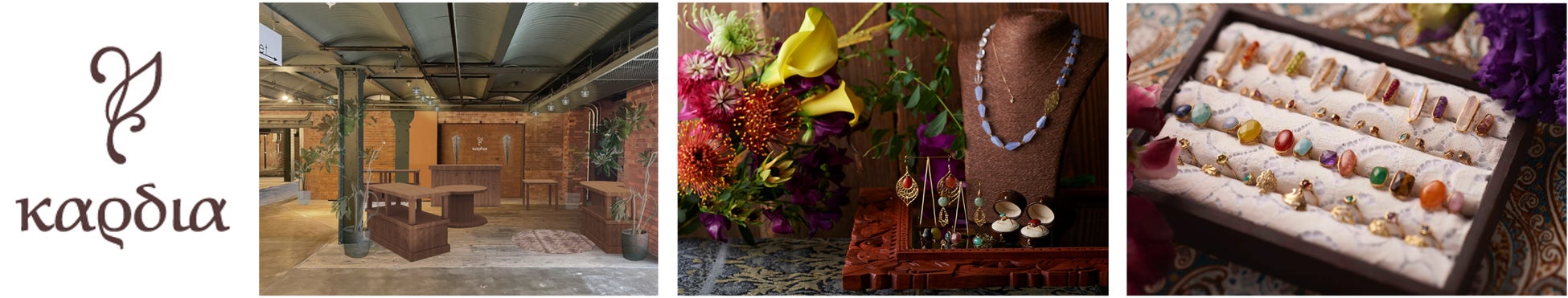 天然石オリエンタルジュエリー【καρδια(kardia)】。”καρδια”(カルディア)とはギリシャ語で『こころ』という意味。『カルディア』では「心踊る身近なジュエリー」と「セクシーな可愛らしさ」をコンセプトに、色鮮やかな天然石を使用したオリエンタルジュエリーを一つ一つ制作しています。手に取るとポッと心が温かくなる様な、ワクワクするような、日常を彩るアクセサリーをお届けします。エキゾチック感溢れるオンリーワン天然石ジュエリーとの素敵な出会いをお楽しみください。