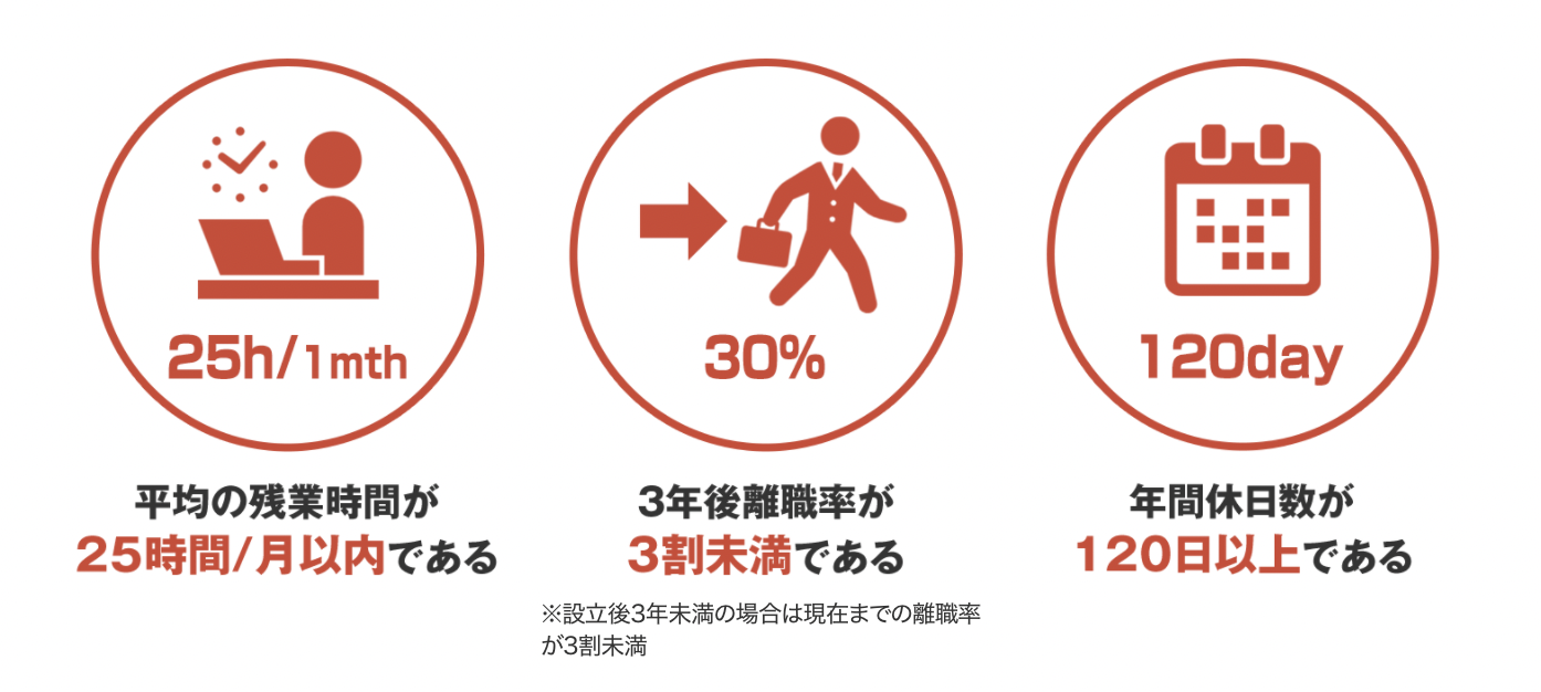 (3条件:残業時間が25時間/月未満、3年後離職率が3割未満、年間休日数が120日以上)