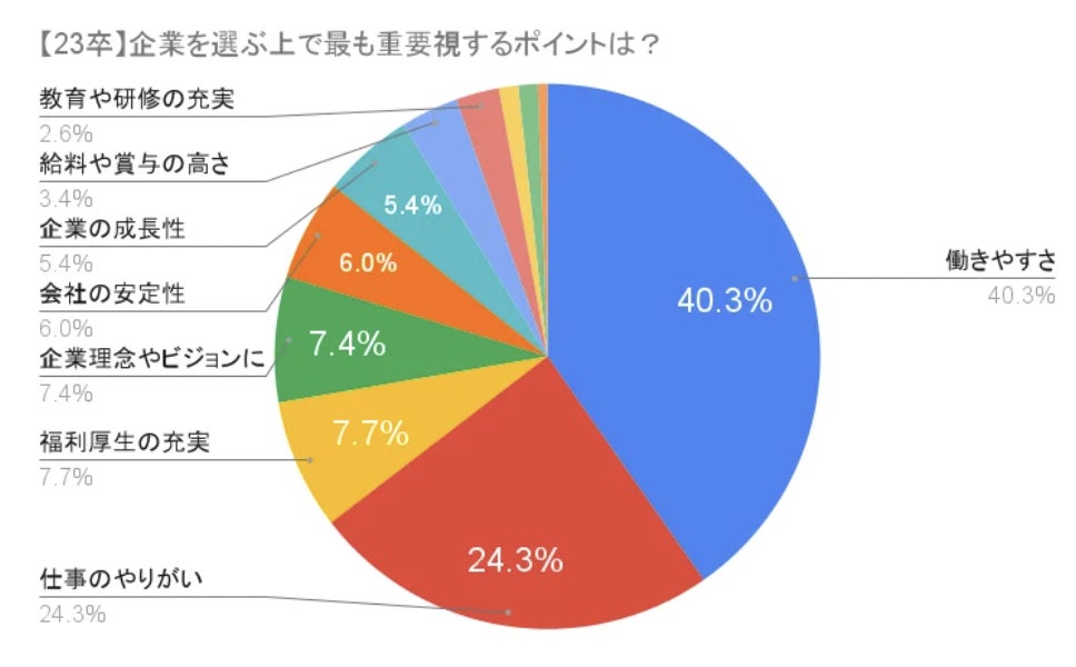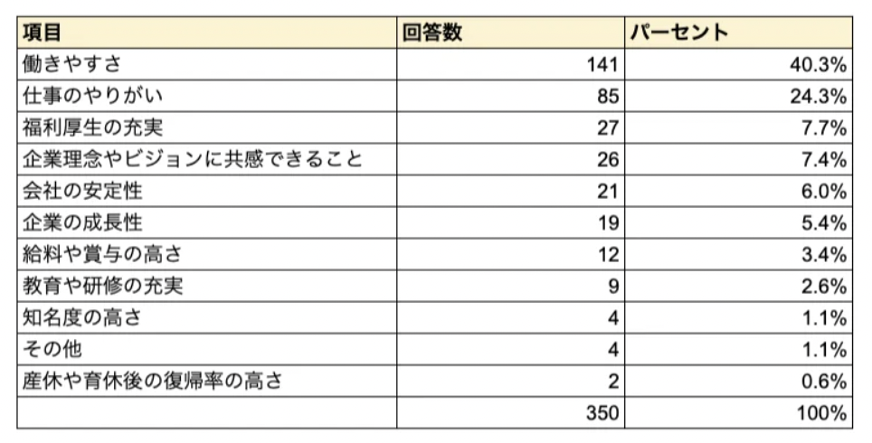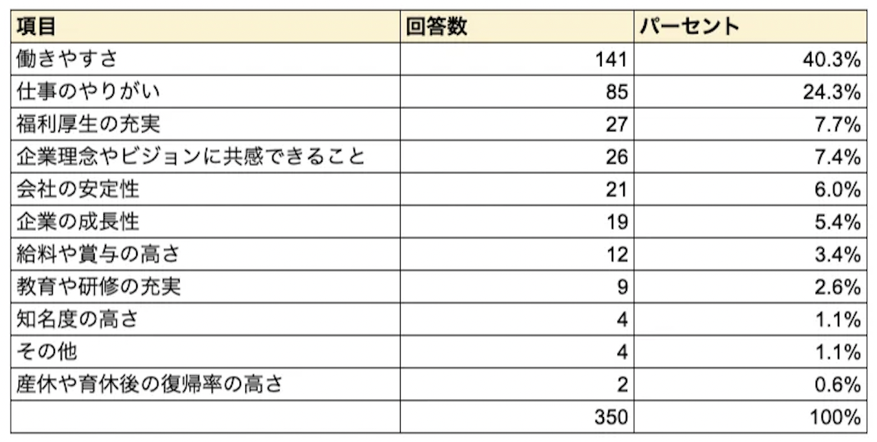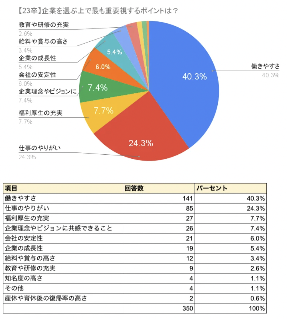 実際に弊社が350名の就活生に取ったアンケートでも、企業に求める条件として「やりがい」や「安定性」以上に「働きやすさ」を重視する学生が多いという結果になりました。