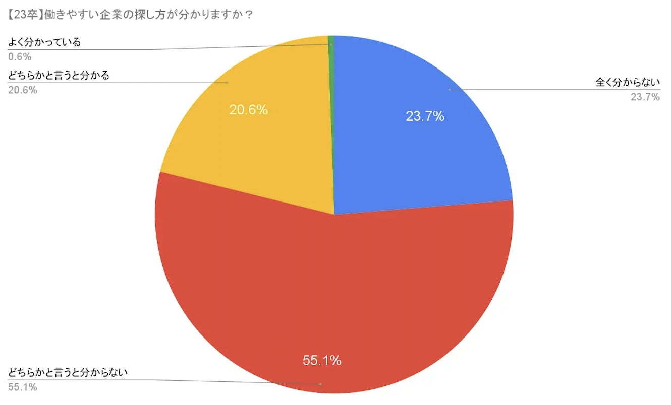 しかし、同時に「働きやすい企業の探し方が分かる」と答えた学生が21%である一方、「働きやすい企業の探し方が分からない」と答えた学生が79%となりました。