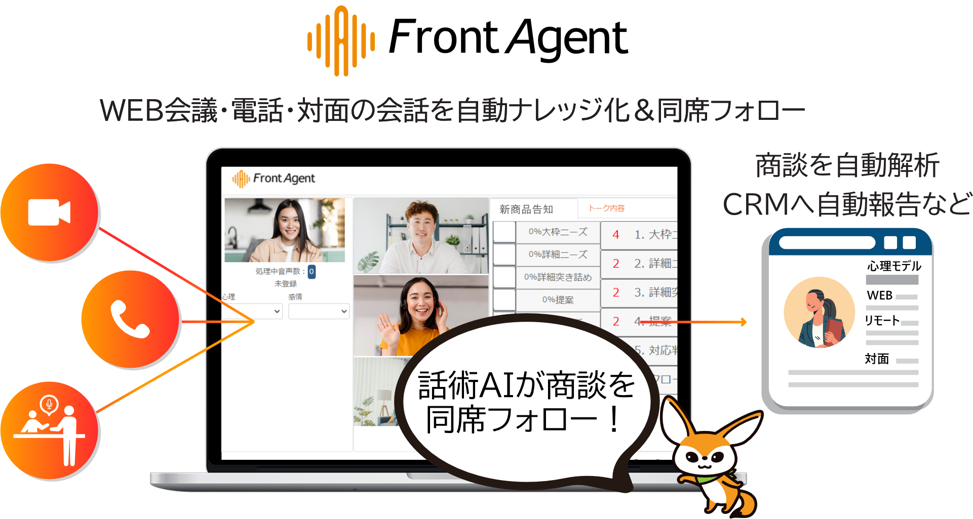 「Front Agent®」とは、セールス担当の商談をシステムが現場支援し、さらに組織的かつ恒久的にトップセールスを輩出する仕組み化のために開発されたAI商談アシストプラットフォームです。社内トップセールスの商談ノウハウをノーコードで即座にAIにでき、AIが社員のWEB・対面の会議や電話中にリアルタイムで会話の支援をします。