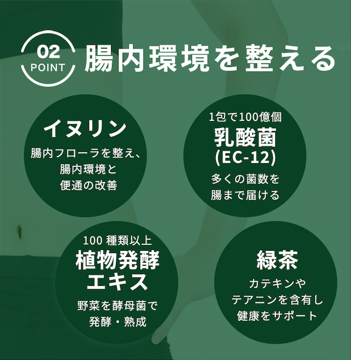 腸内のビフィズス菌による発酵・増殖に利用され、腸内フローラを良くするイヌリンを配合。また、胃酸や胆汁、熱に強く腸まで届けることができる乳酸菌(EC-12)を1包で約100億個配合しています。