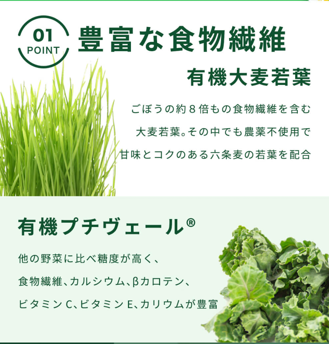 1)農薬・化学肥料一切不使用で甘味と刻のある六条麦の若葉を配合