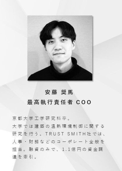 Shoma graduated from Kyoto University, Graduate School of Engineering. As a student, he conducted research on thermal environmental controls of buildings. At TRUST SMITH, he is responsible for overall corporate affairs including HR and finance.