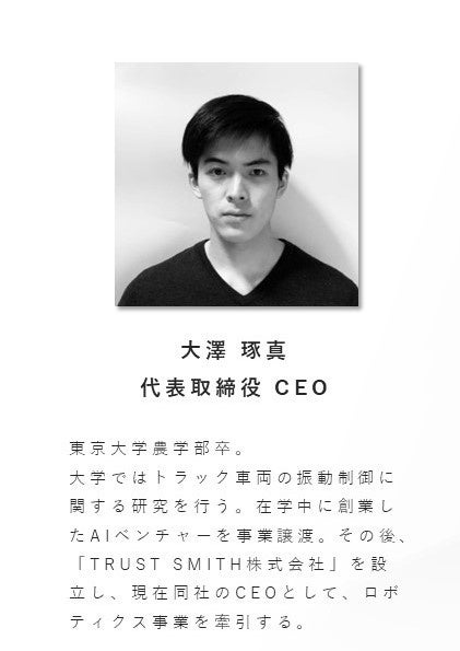 Takuma graduated from the University of Tokyo, Department of Agricultural Engineering, Faculty of Agriculture. As a student, he performed research on vehicle vibration control as well as founded and completed a business transfer of an AI-related startup. He later founded TRUST SMITH, and is currently the founder and CEO of RENATUS ROBOTICS.