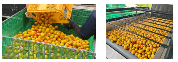 この地方の収穫方法としては“拾い梅”といって樹の下に青いネットを敷き、完熟して自然落下した梅を受け止めそれを拾い集めるのが一般的。