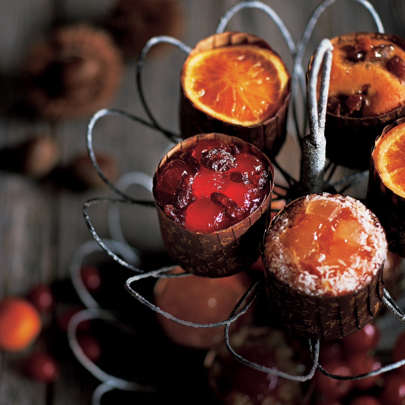 ジュエリーのようなカップケーキ。つやつや光るシロップ漬けや、瑞々しいセミドライの果実がごろごろ。どこから食べても果実の味が広がります。しっとり、リッチな果実感が、まるでフルーツ!なカップケーキです。