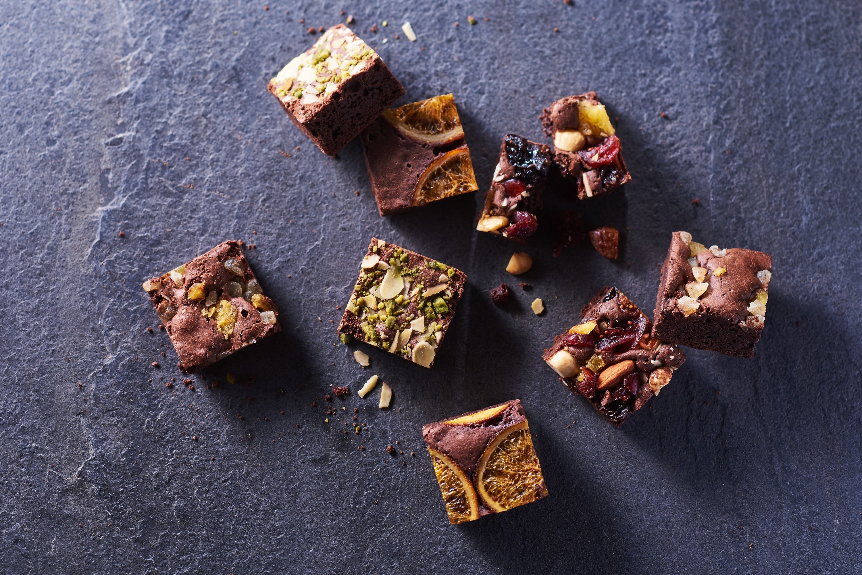 濃厚なチョコレートの生地に、香ばしいナッツや甘酸っぱいフルーツをトッピング。ピスタチオとアーモンド、ごろっとしたパイナップルやネーブル、たっぷりのドライフルーツとナッツ…。おいしさをぎゅっと詰め込んだキューブが、お口に小さなしあわせをお届けします。