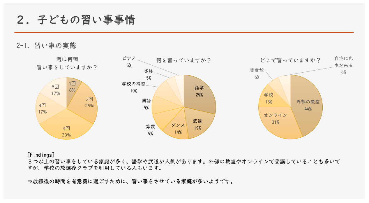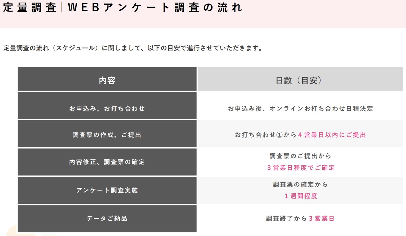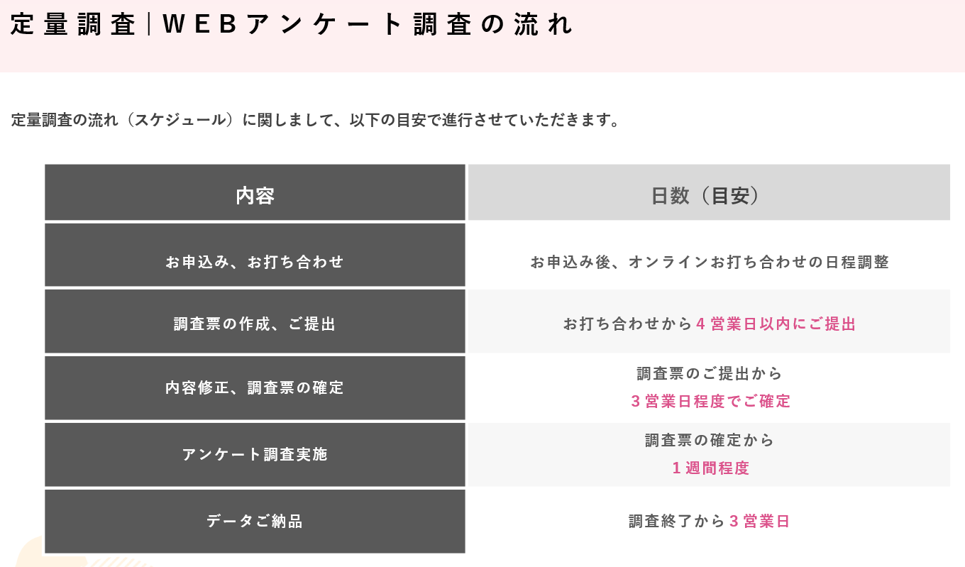 また、WEBアンケートに関しては、弊社のパネルからターゲットに合わせた調査対象者を抽出しオンライン上で調査を実施、発注から2週間程度でレポート提出が可能です。
