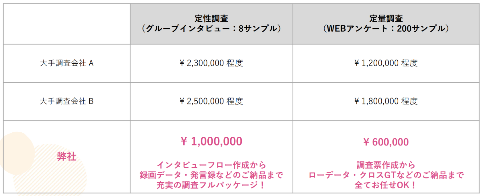 インタビューフロー作成から、発言録とサマリーレポートのご納品まで、充実の調査フルパッケージを、大手の半額以下の費用※2でご提供します。また、発言録とサマリーレポートはすべて日本語でご納品します。
