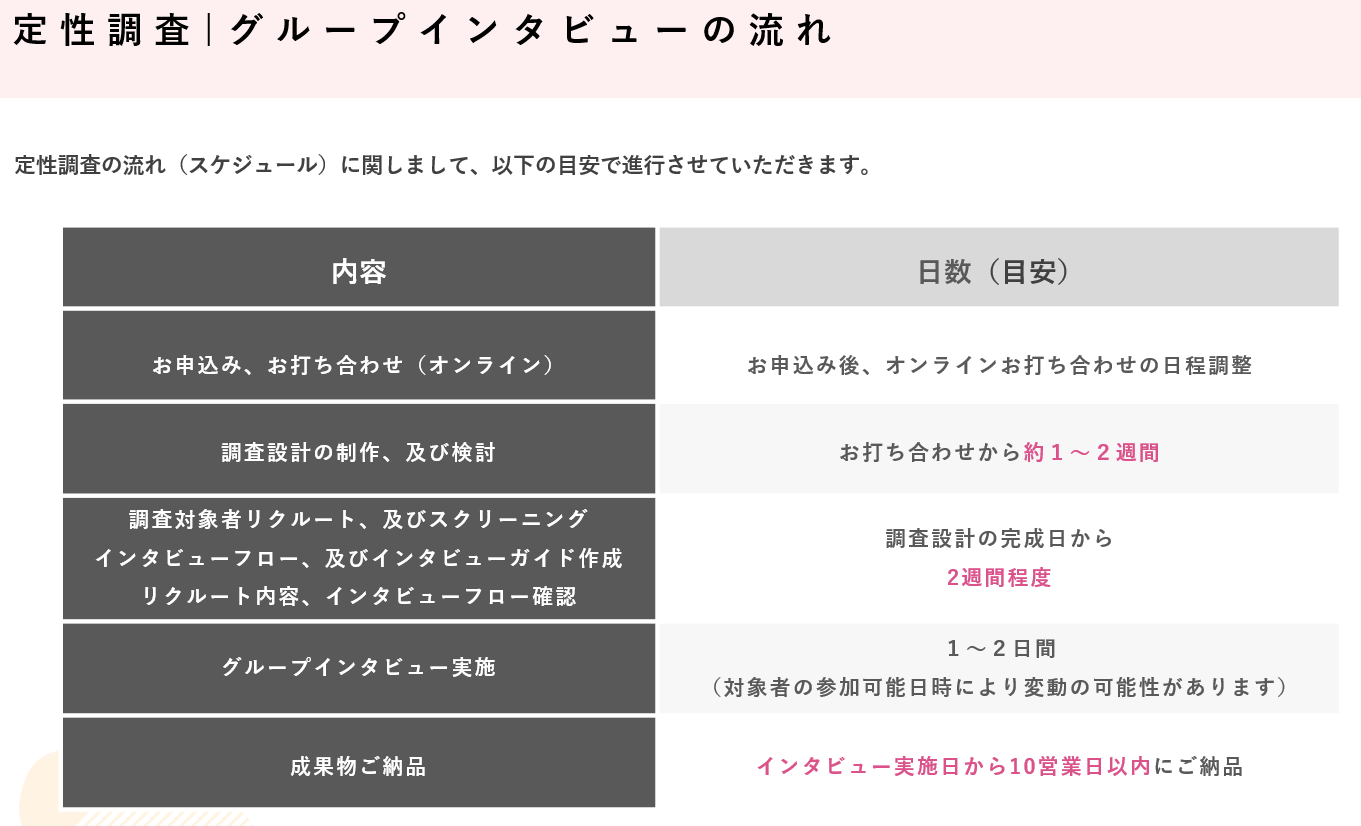 グループインタビューとWEBアンケート調査のご納品までの流れはそれぞれ以下になります。