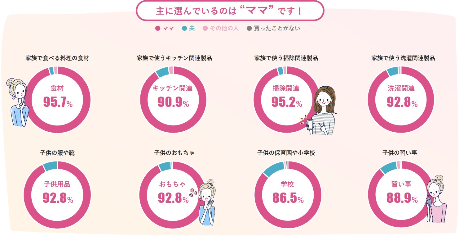 「HAJIMARIMOM.com vietnam」がフォロワーに向けて行ったアンケート調査でも、家族で使う各種日用品や子供に関する消費に関して主に誰が選んでいるかを聞いたところ、約9割の世帯でママが選んでいることが分かりました。