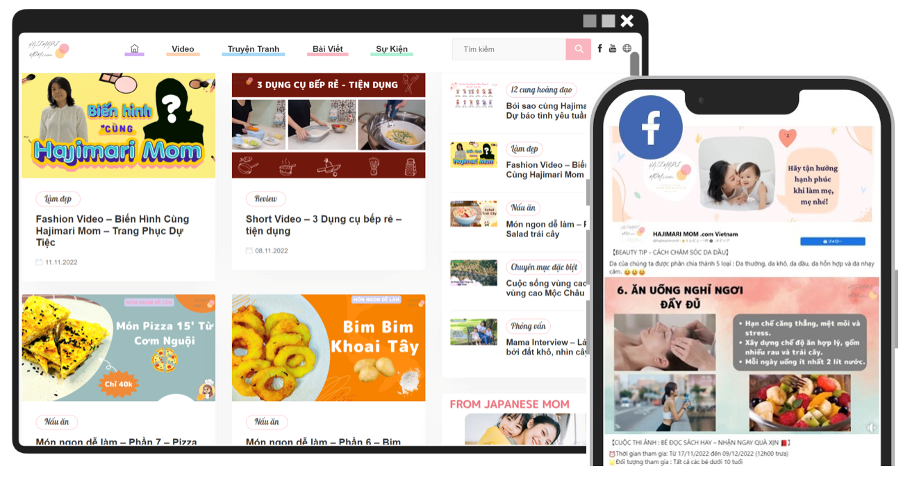 制作したコンテンツは「HAJIMARIMOM.com vietnam」のWEBサイトとFacebookページで配信し、広告なども駆使しながらご希望のターゲットリーチ数へ到達※3させます。