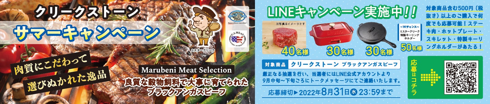 丸紅ミートセレクションでは、2022年8月1日~31日、柔らかい肉質と旨味が人気のブラックアンガスビーフの専門ブランド・クリークストーンの対象商品をご購入いただいた方を対象に、ステーキ肉やホットプレートなどが当たるLINEキャンペーンを実施します。