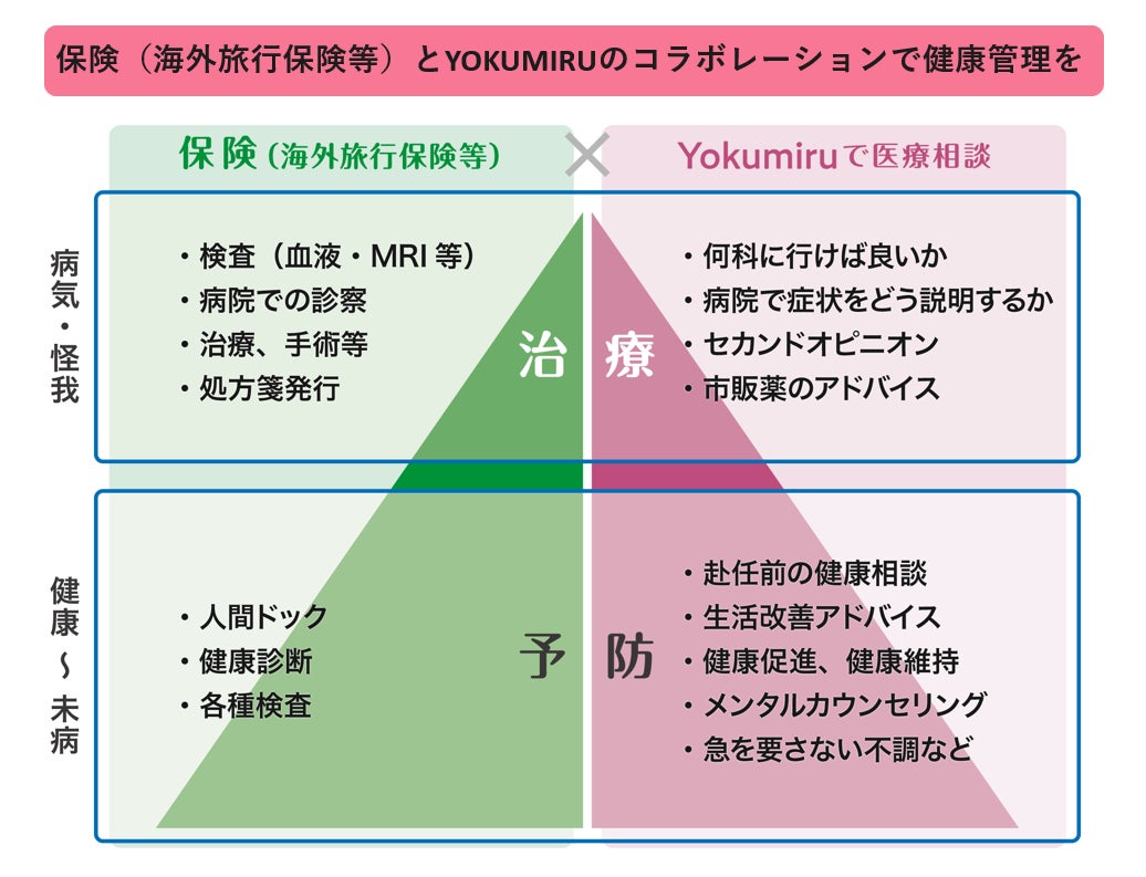 海外旅行保険はもちろん必要ですが、それを使うときは緊急性が高いか重篤化したときです。そうなる前に、ヨクミルで日本人医師に相談することで、従業員の健康維持が可能になります。保険とヨクミルの両方を持つことで『安心』が得られ、海外での健康的な生活を実現できます。