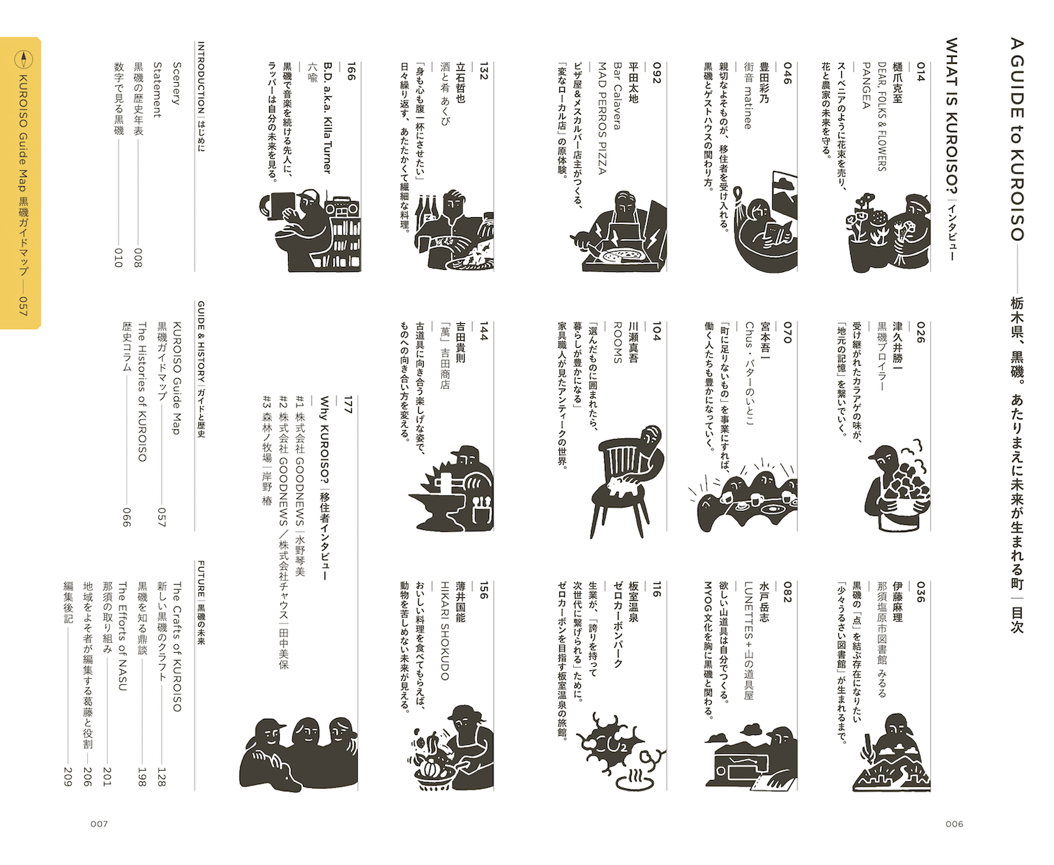 しかし、今までは「知る人ぞ知る」地域であり、人々に愛されながらも、旅行ガイド本などで多くのページが割かれることはありませんでした。よって、1冊丸ごと「黒磯」をテーマにしたガイド本は、おそらく本書が史上初。これまで黒磯の本がつくられなかった理由は、その魅力を一言で語るのがとても難しかったからではないでしょうか。今回、風旅出版では、考えられる工夫をすべて注ぎ込み「ひとつの町の編集」に挑戦しました。