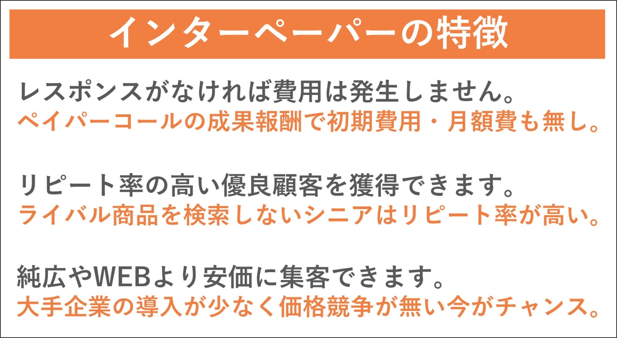 | ※成果報酬型の紙媒体広告システム「インターペーパー」とは お問い合わせ電話件数によって広告費を支払う成果報酬型の広告出稿を、新聞や雑誌などの紙媒体広告で行うことができるサービス。 株式会社インターカラーが2017年に開発し、運用を開始した。 現在、通信販売事業者など約600社の広告主と350社を超える紙広告媒体が利用している。 詳細は同社ホームページへ : https://www.intercolor.co.jp/ インターペーパーお問合せ先:https://interpaper.jp/cliant/ |