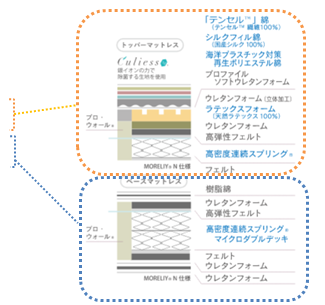 希少な国産シルク綿を使用し、高級感と柔らかさを追求した「TD-テーレ」(テーレはフランス語で大地の意味)と1枚のマットレスにスプリングを3段内蔵したトリプルデッキで柔らかさの中にも安定感のある「TD-ラメール」(ラメールはフランス語で海の意味)の2タイプを展開。いずれも、表面生地に除菌機能糸を使用することでマットレス自体が除菌効果を発揮し、衛生的にお使いいただけます。サイズは、シングル、セミダブル、ダブル、ワイドダブル、クイーンの5サイズで、すべて受注生産(納期約40日)で対応いたします。