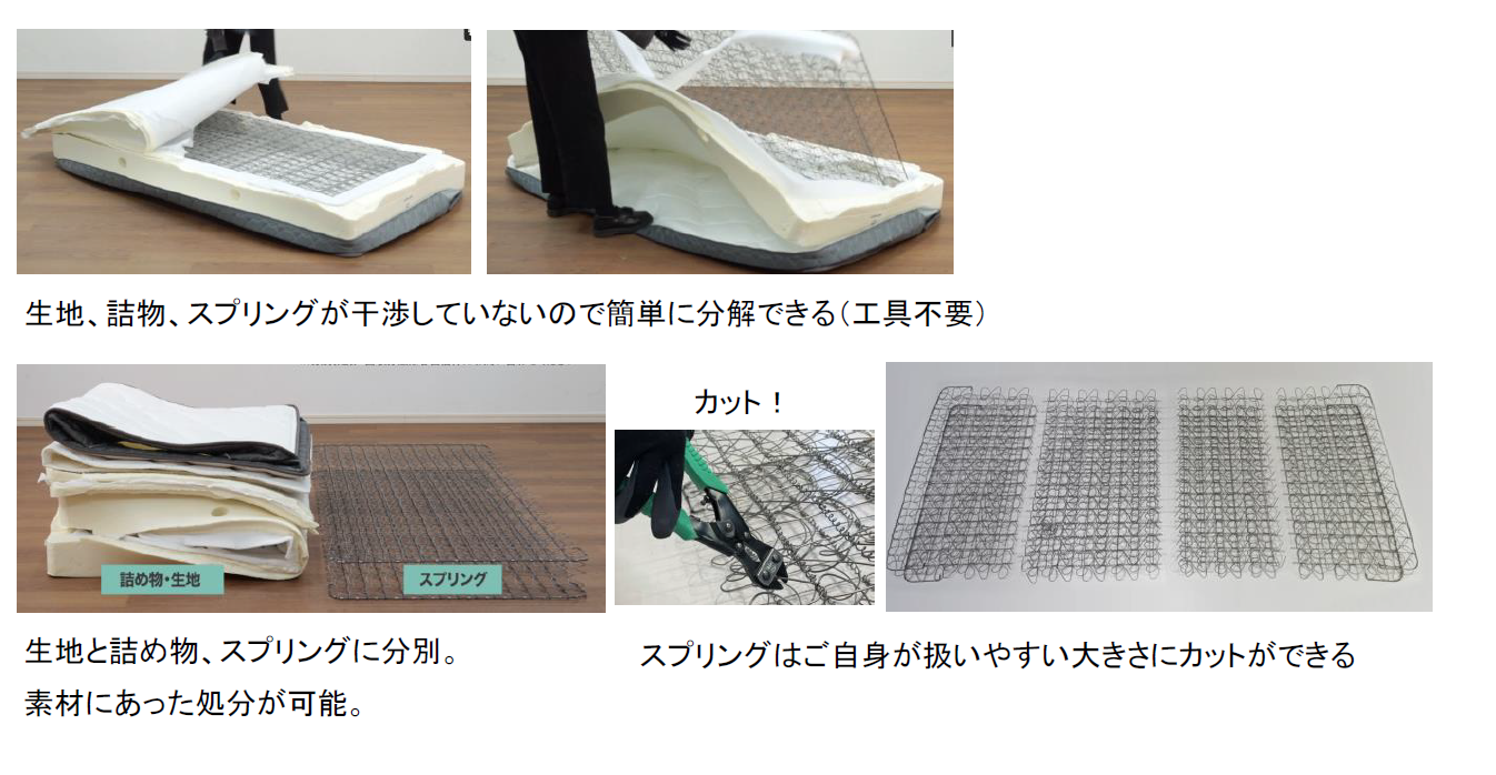このたび、サステナブル仕様にリニューアルする「THE FRANCEBED」は、従来のコンセプトに、環境配慮という考え方を加えました。マットレスの詰め物には、海洋プラスチックごみからつくった再生ポリエステル綿や、環境に優しい製法でつくられるテンセル繊維綿、焼却しても有害物質は出ず、土に埋めると自然に還るという特質をもつ100%天然ラテックスフォームなど、環境への負荷が少ない素材を採用しています。さらに、適正処理困難物*1として指定され廃棄時に困難を極めるスプリング入りマットレスにおいて、生活者が一人でも分解、分別ができる構造を採用することで、廃棄時の負担を軽減します。また、環境への負荷が少なく環境保全に役立つと認められた商品につけられるエコマーク認定を取得しており、エシカル消費を促進します。