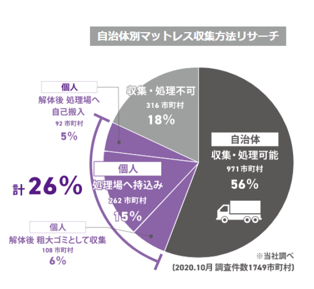 2020年10月に行ったフランスベッドの独自調査によると26%の自治体で個人の持ち込み・解体を行わなければ処分をしない、また、18%の自治体では収集・処理しないという結果でした。