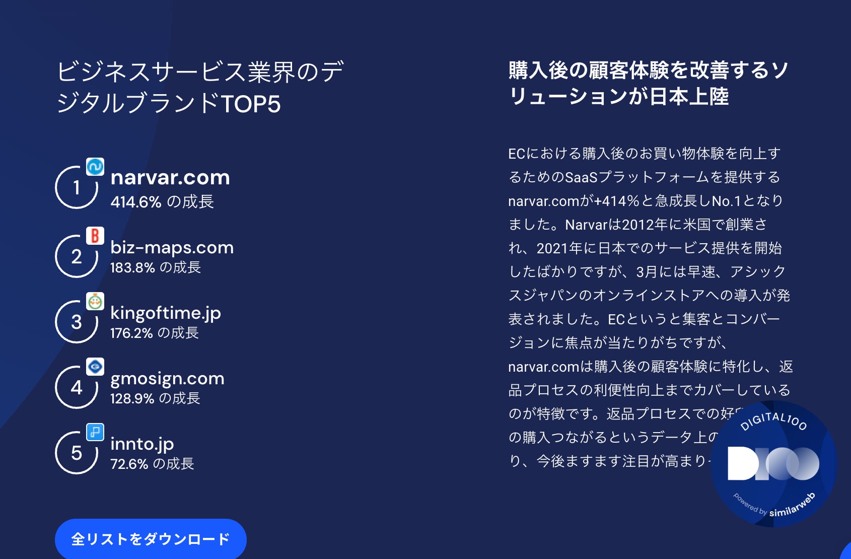 【日本で最も急成長したデジタルブランドTOP100・ビジネスサービス業界部門】第1位にNarvarが選ばれました