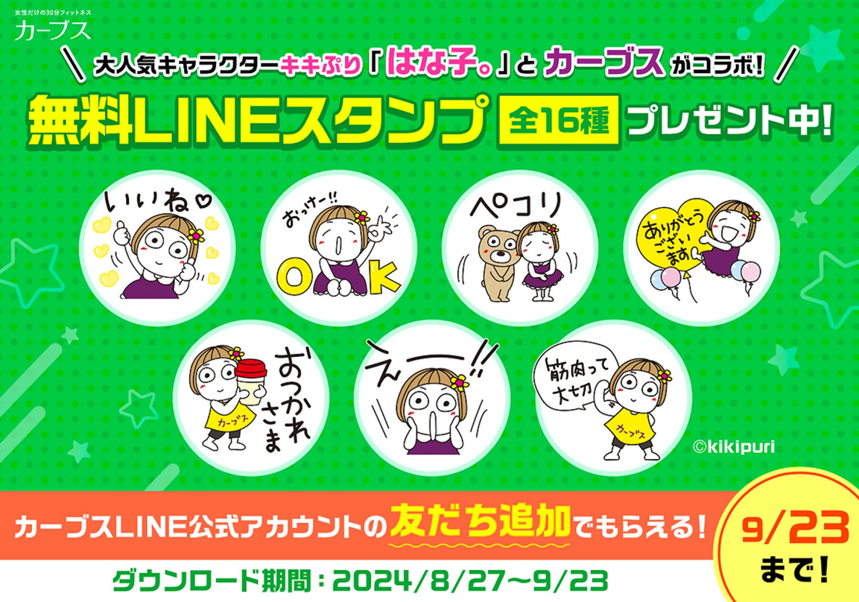「女性だけの30分フィットネス カーブス」など運動施設を運営する株式会社カーブスジャパン(本社所在地:東京都港区/代表:増本 岳)は、人気クリエイター「キキぷり」とのコラボによるLINEスタンプを2024年8月27日(火)から期間限定で無料配布を開始いたしました。このLINEスタンプは、カーブスのLINE公式アカウントを友だち追加することでダウンロードが可能で、カーブスとしては外部クリエイターとの初のコラボによるクリエイタースタンプとなります。