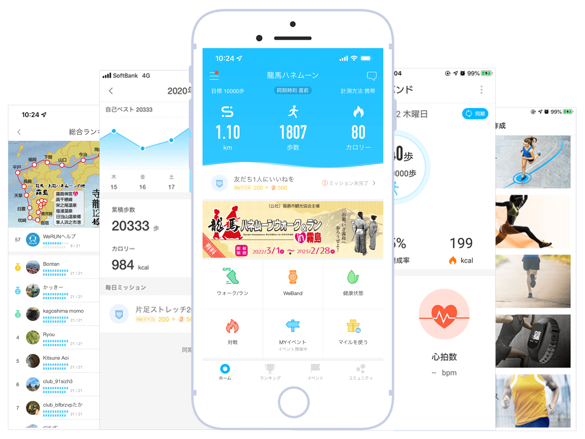 WeRUNはスマートフォンやウェアラブル端末との連携によって、歩数をはじめ睡眠、心拍数などの健康状態を計測記録し、歩数や距離データを元に多様なウォーキングイベントを簡単に開催できるアプリです。