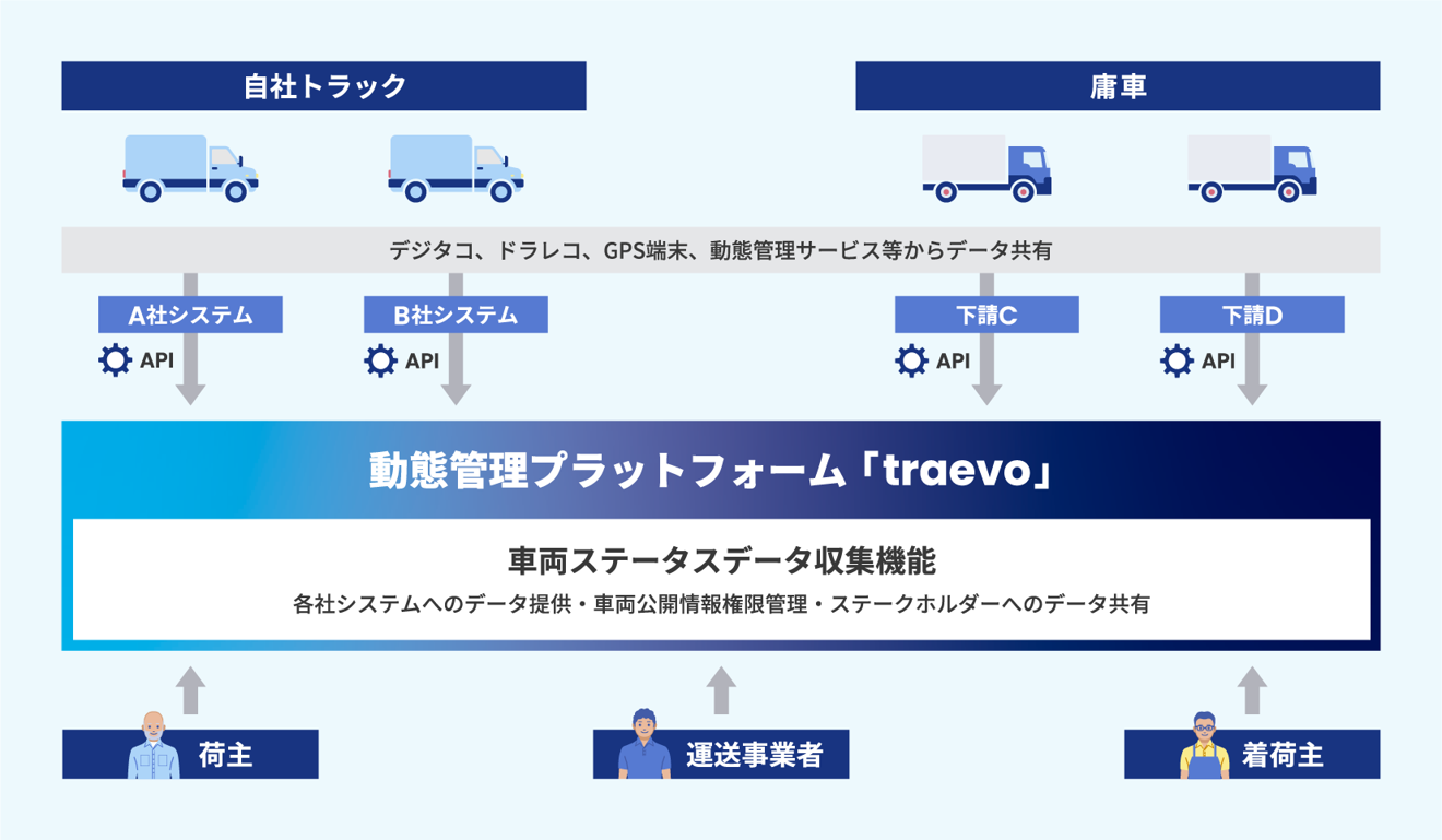 動態管理プラットフォーム「traevo」は、トラックに搭載しているデジタルタコグラフや動態管理サービスから、車両の動態(車両の位置や作業ステータス)情報を車載機器メーカー、サービスを問わず一元的に集約・管理することにより、荷主・運送事業者・着荷主などステークホルダー内で情報を共有する仕組みです。本プラットフォームの普及は、物流業界に留まらず、製造業などの荷主、小売りや流通業界などの着荷主など、サプライチェーン全体で発生しているアナログ作業のデジタル化が期待できることから、物流における2024年問題への貢献も期待できます。
