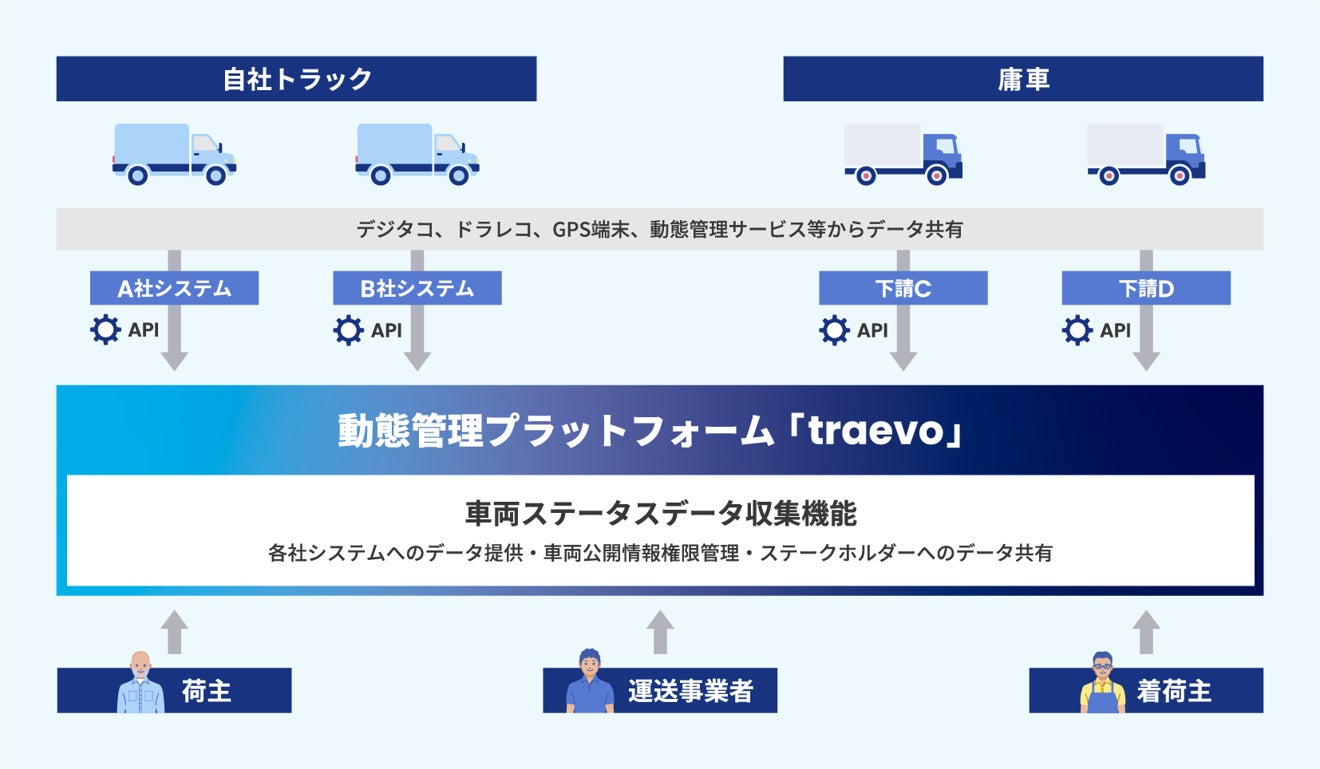 株式会社traevo(東京都港区、代表取締役社長 鈴木 久夫、以下 traevo)は、物流事業者、荷主企業、デバイスメーカーなど52社(※1)の協力により開発された動態管理プラットフォーム「traevo(トラエボ)」を9月1日(木)よりサービス提供を開始します。価格はデータ利用料とし1車両につき500円/月でtraevoのサイトからお申込みが可能となります。