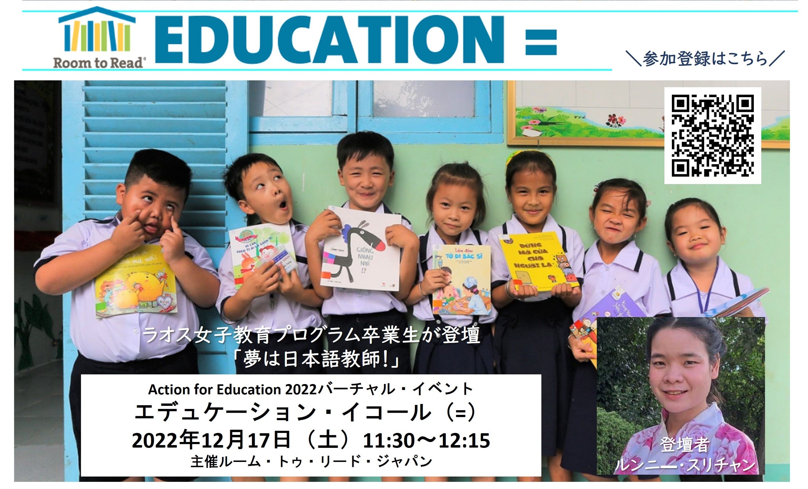 認定NPO法人「ルーム・トゥ・リード・ジャパン(千葉県市川市/以下、ルーム・トゥ・リード)」では、12月25日(日)まで開催のファンドレイズキャンペーン「Action for Education 2022 ~エデュケーション・イコール~(以下、Action for Education 2022)」のキックオフとして12月17日(土)にオンラインイベントを行います。