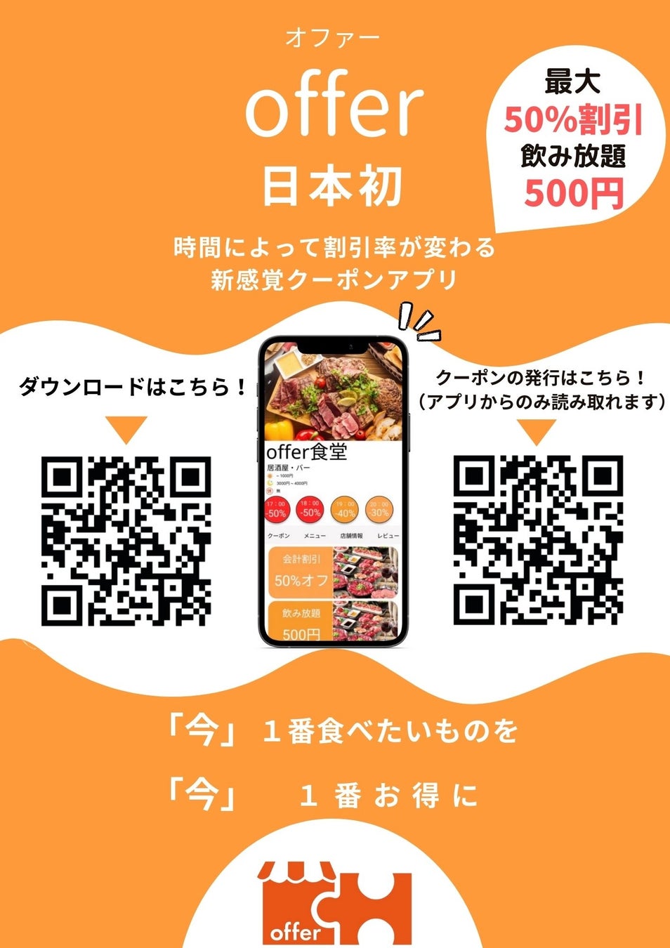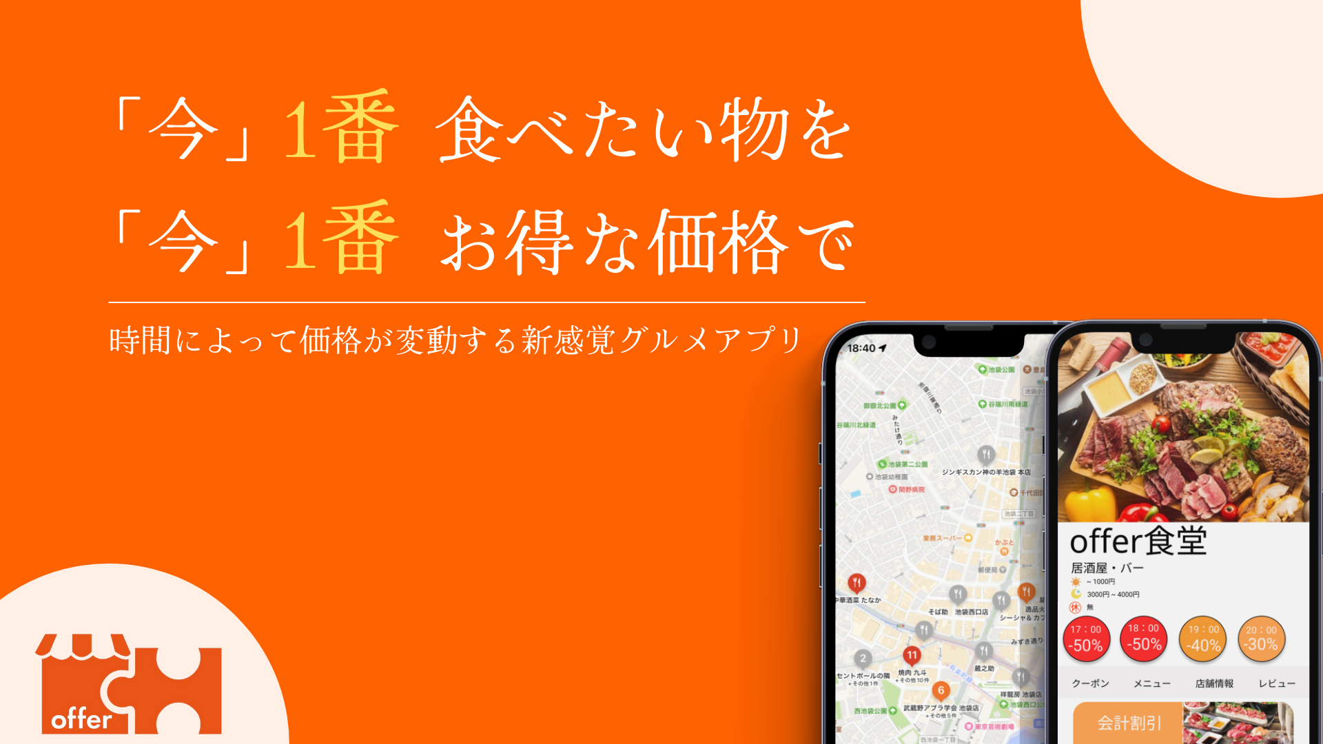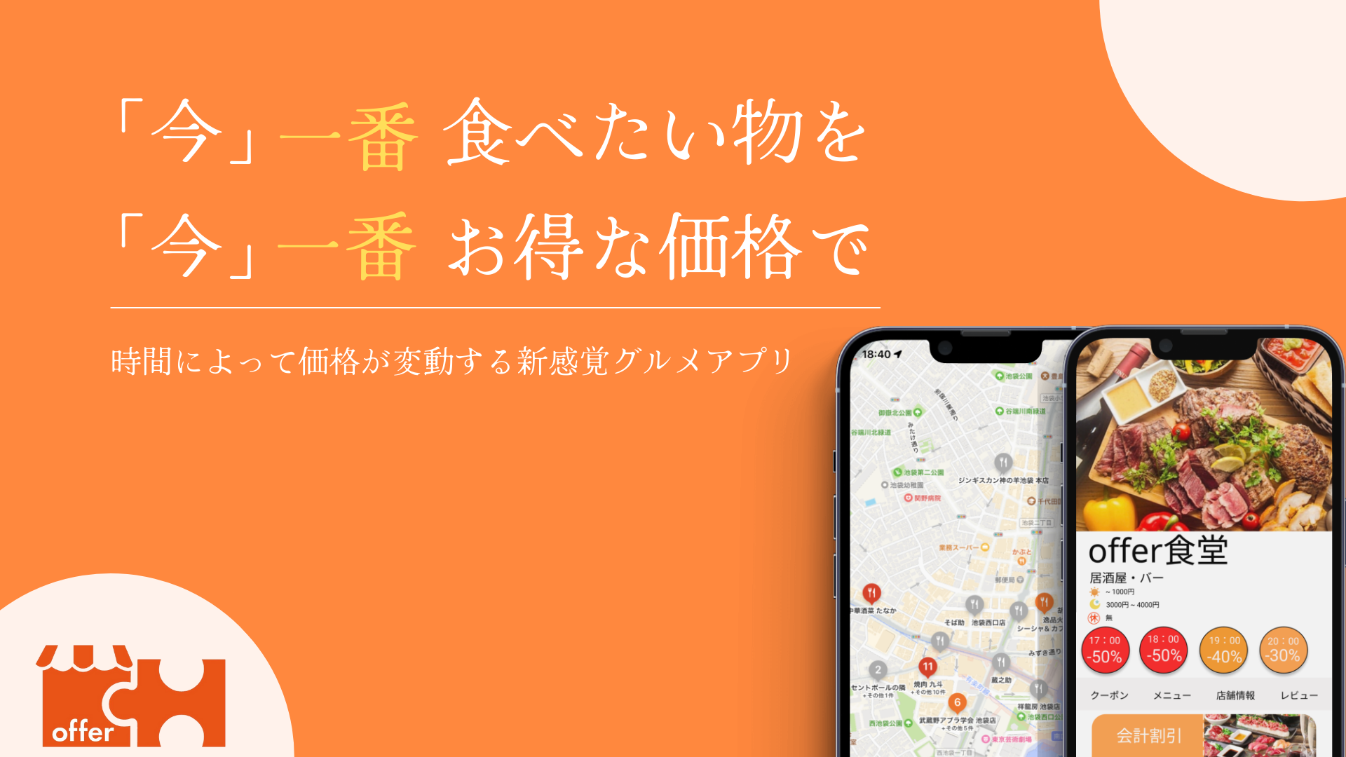 「オファー」は、《時間帯ごとにリアルタイムで飲食店の価格がお得に変動》する新感覚グルメアプリです!!