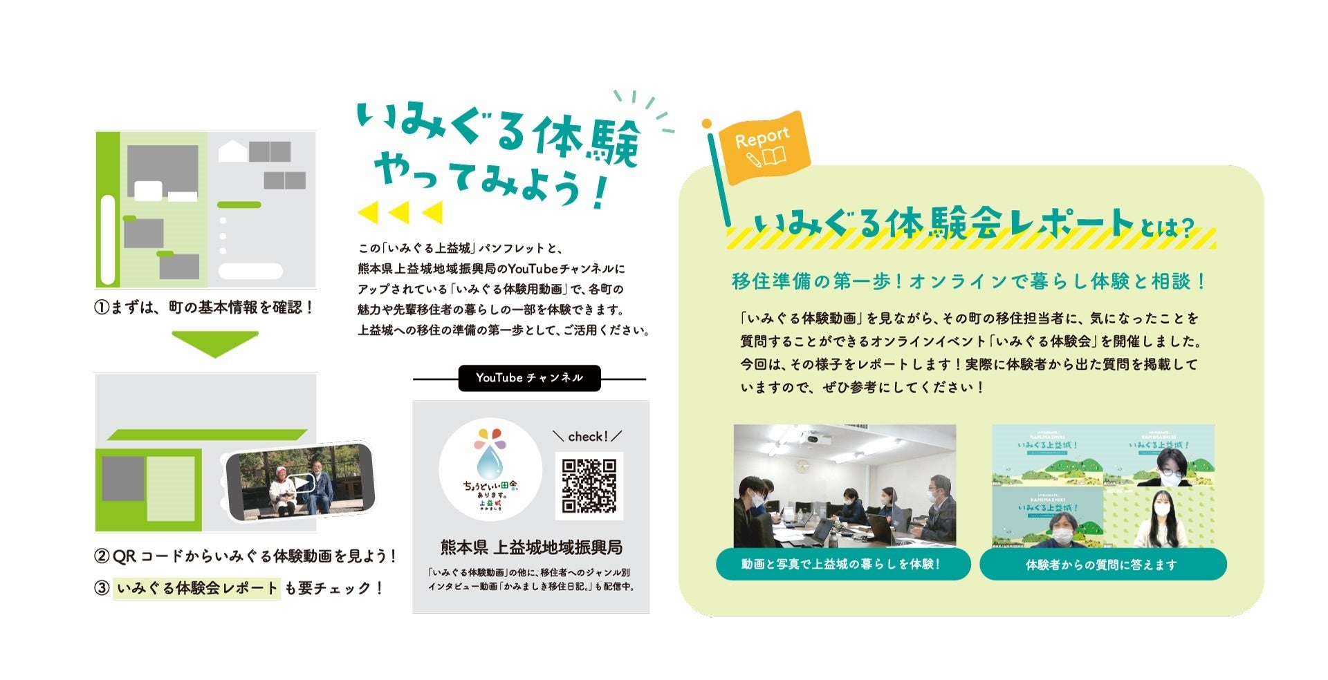 この「いみぐる上益城」パンフレットと、熊本県上益城地域振興局のYouTubeチャンネルにアップされている「いみぐる体験用動画」で、各町の魅力や先輩移住者の暮らしを見ることができます。