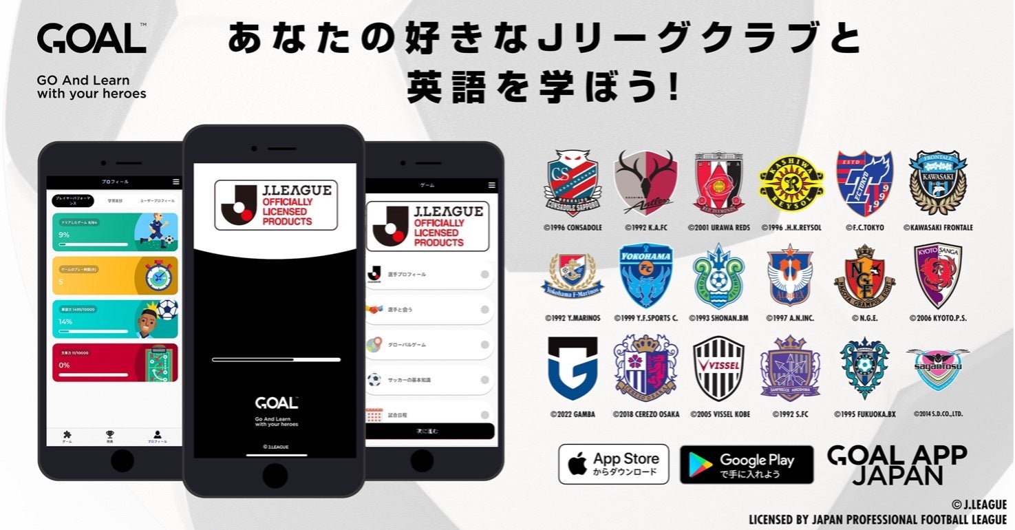 GOAL APP JAPAN株式会社(本社:広島県広島市、取締役COO:淵上優、以下:当社)は、公益社団法人日本プロサッカーリーグ(以下:Jリーグ)とライセンス契約を締結し国内初のサッカーリーグと繋がった語学学習アプリのJリーグ版をリリースしました。