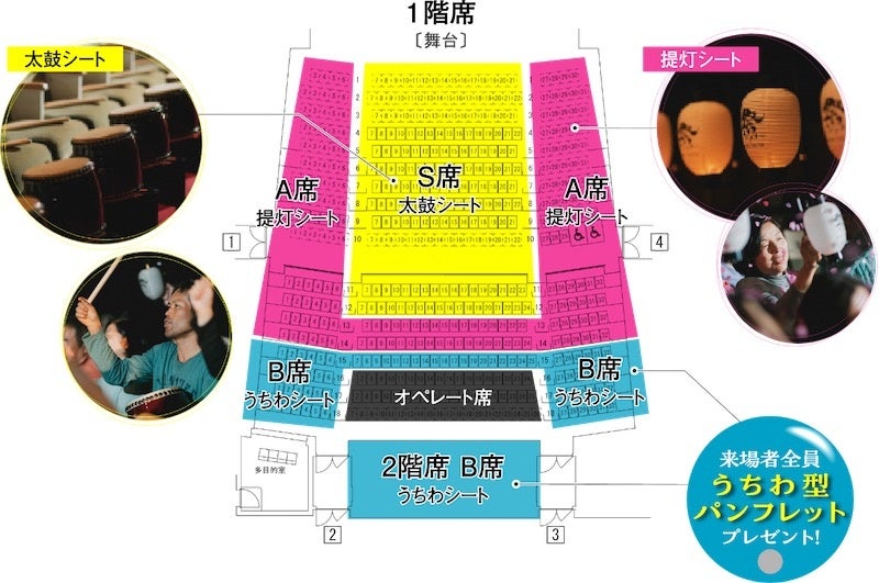 太鼓シート・提灯シート・うちわシートの3種類の席種によって、異なる体験を楽しめます。太鼓シートでは和太鼓を、提灯シートでは手持ちの提灯を、うちわは全席にご用意。会場が一体となって祭シアターにしかない面白さと感動を味わうことができます。