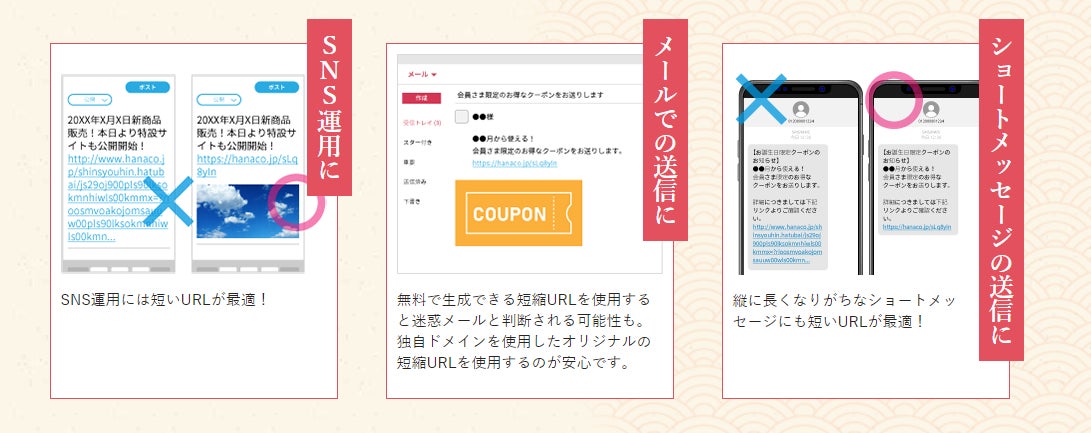 文字数制限のあるSNSで安全に商品詳細ページのURLをPRすることができます。また、SMS(ショートメッセージ)やEメールにおいても効果的にご利用いただくことが可能です。