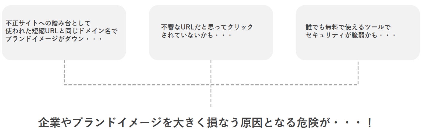 企業のSNS運用において、ECサイトの商品ページなどを紹介する際に、パラメータ等が付与された長いURLのままでは1投稿あたりの文字数の制限があるため、海外製のフリーのURL短縮サービスを安易に利用しているケースが見受けられています。フリーの共用ドメインにはブランドイメージを損なう様々なリスクが多数存在しており、この問題を解決し、企業側は安全にSNS運用を行い、ユーザ側も安心してURLから閲覧できる環境を創る必要があると考えました。