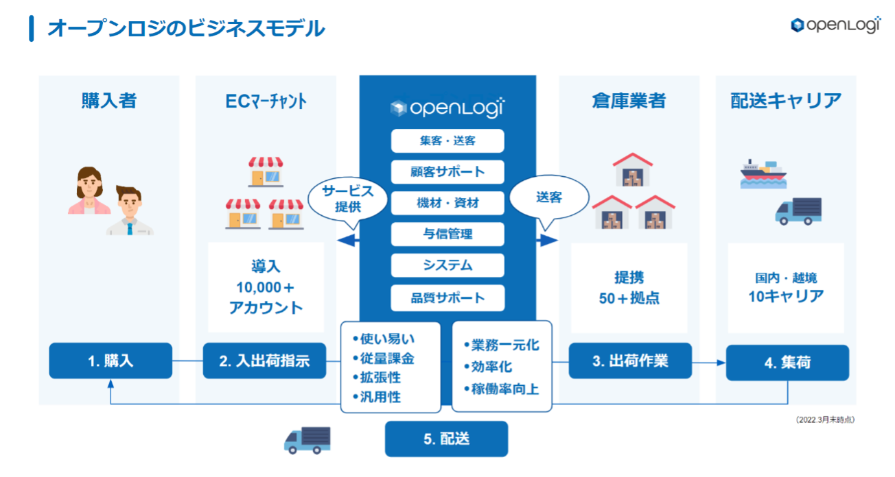 「テクノロジーを使い、サイロ化された物流をネットワーク化し、データを起点にモノの流れを革新する」をビジョンに掲げ、物流フルフィルメントプラットフォーム「オープンロジ」を提供。独自の倉庫管理システムを通じて全国の倉庫をネットワーク化し、標準化した仕様とオペレーションにより物流業務の効率化と一元化を実現、固定費ゼロ・従量課金で利用可能な物流フルフィルメントサービスを提供しており、導入アカウント数は約10,800(2022年3月末時点)となっております。