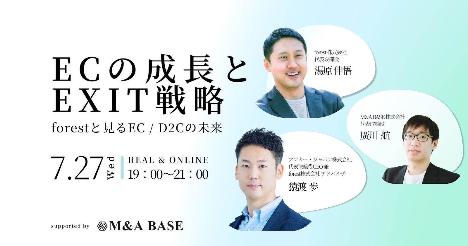 IT業界における企業の成長を支援するM&A BASE株式会社(本社:東京都中央区、代表取締役:廣川 航)は、forest株式会社(以下「forest」)代表取締役 湯原 伸悟氏、アンカー・ジャパン株式会社(以下「アンカー・ジャパン」)代表取締役CEOで、forestのアドバイザーも務める猿渡 歩氏をお招きし、オンラインイベント「ECの成長とEXIT戦略 -forestと見るEC / D2Cの未来- 」を2022年7月27日(水)に開催します。