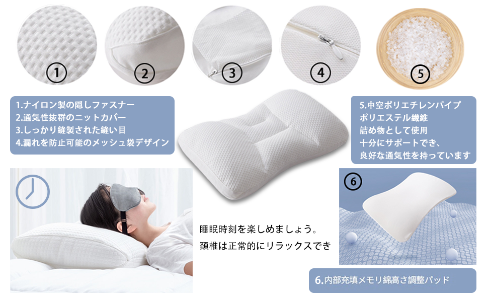 枕のサイズは約38*60*10cm(幅*長さ*高さ)、通常サイズの枕が使用する枕カバーに適用しています。枕の重さは約1.3kg、ポリエチレン製中空ソフトパイプとポリエステル繊維で充填されます。背面にあるファスナーで枕を開けます。ご必要により枕の高さと柔軟さが調節でき、自分にぴったりの枕を作り出します。