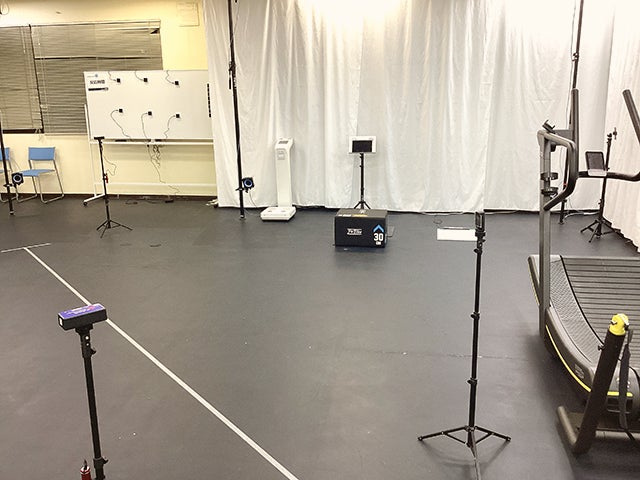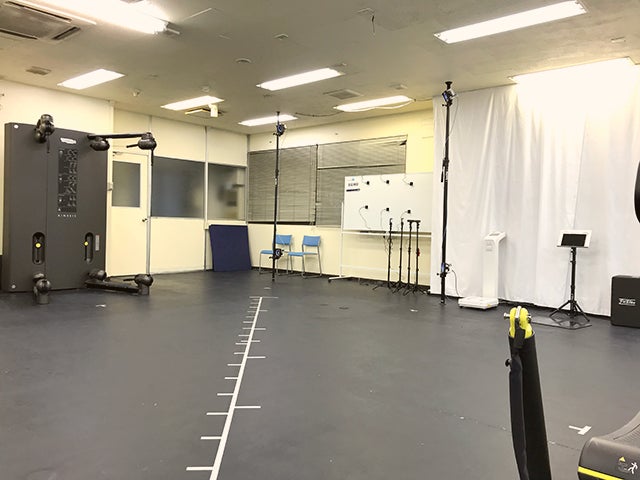 最大240fpsまで撮影できるカメラを12台使った3次元モーションキャプチャシステムで、あらゆる動きを可視化します。5mx5m程度のフリースペースでの動きを自由に記録するだけでなく、モーションキャプチャシステムを用いた独自の評価システム(筋力バランス評価、歩行/ランニング評価、柔軟性評価)もご利用いただけます。