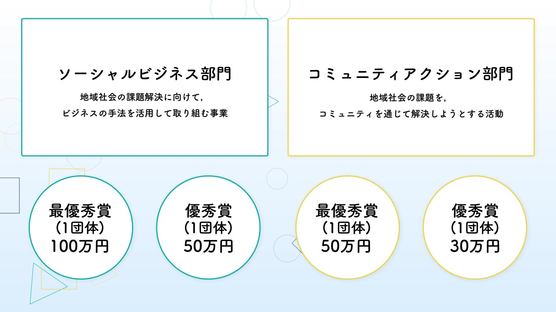 具体的には、地域社会の課題解決に向けて、ビジネスの手法を活用して東北・新潟地域の発展に取り組む事業から「ソーシャルビジネス部門 」として最優秀賞1団体(助成金:100万円)、優秀賞1団体(助成金:50万円)を、コミュニティを通じて課題の解決を目指す活動から「コミュニティアクション部門 」として最優秀賞1団体(助成金:50万円)、優秀賞1団体(助成金:30万円)を、それぞれ選定することとしております。