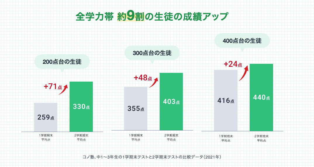 「個別指導 コノ塾」では、全ての学力帯の生徒が成績アップを実現しています。