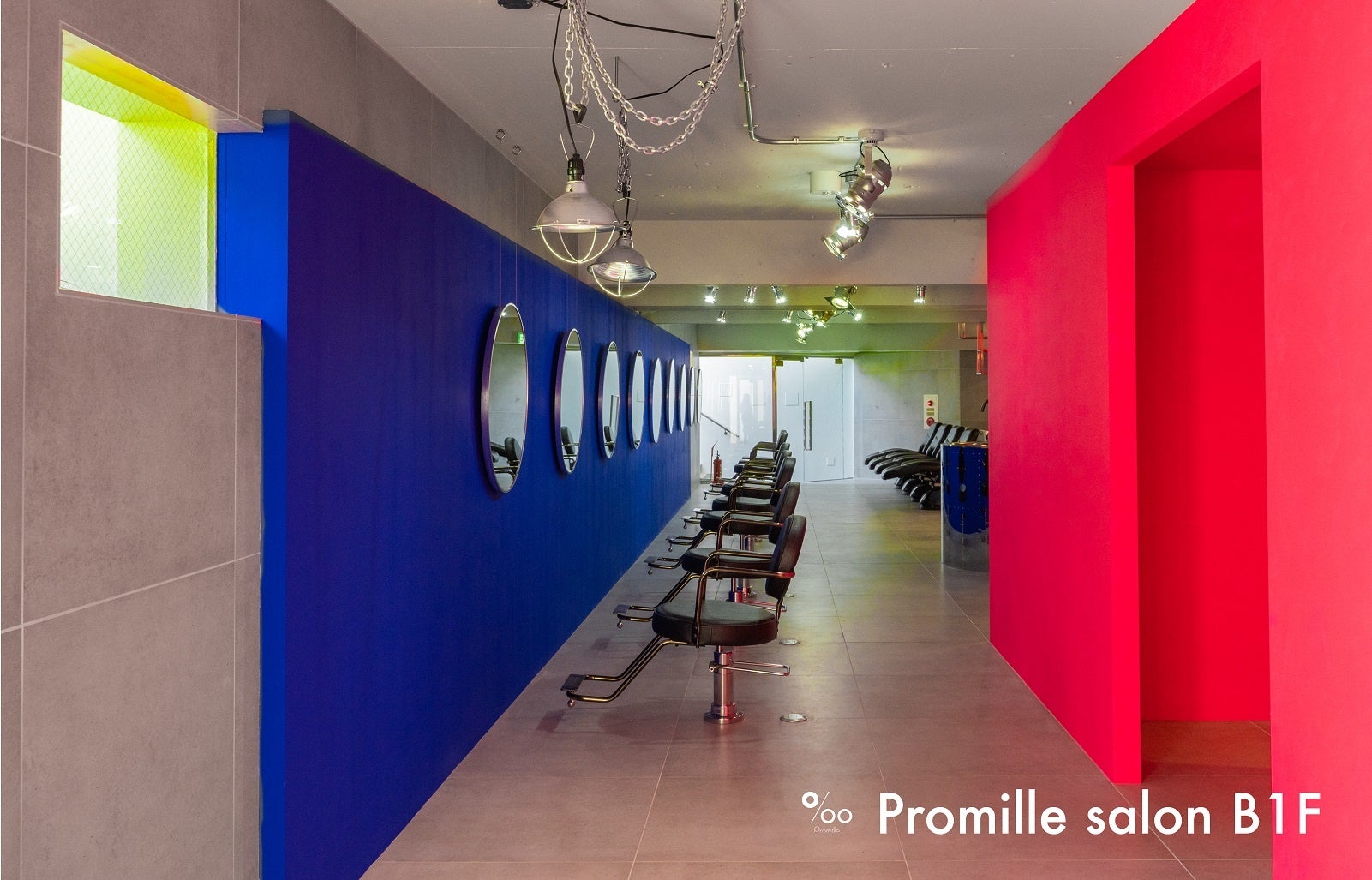 フロアのデザインは、プロミルブランドのアートディレクションを手掛ける、SNS総フォロワー約15万人の人気コラージュアーティストQ-TA氏とコラボレーション。鮮やかな色使いにより、1Fフロアとは対照的な『新しいプロミル』を表現しました。壁に3色のビビッドな特殊塗料を使用した内装は、最先端のトレンド発信地である原宿をイメージ。原宿のストリートに溢れるエネルギーと呼応しながら、来店してくださったお客様と共にブランドとして成長していきたいという願いが込められています。入り口はエネルギッシュなパワーマゼンタを使用した壁面でお客様をお出迎え、セット面はフランスの現代美術家イヴ・クラインによって発明された「インターナショナル・クライン・ブルー」の塗料を一面に贅沢に使用したサファイアブルーの美しい壁面です。サロン奥部にはリフレクトイエローの壁が自然光を反射してサロン内に新たな光を取り込み、マゼンタ・ブルー・イエローの3色が混ざり合うことで、これまでのプロミルとは全く違う、原宿らしい「プロミルの新たな透明感」を表しています。