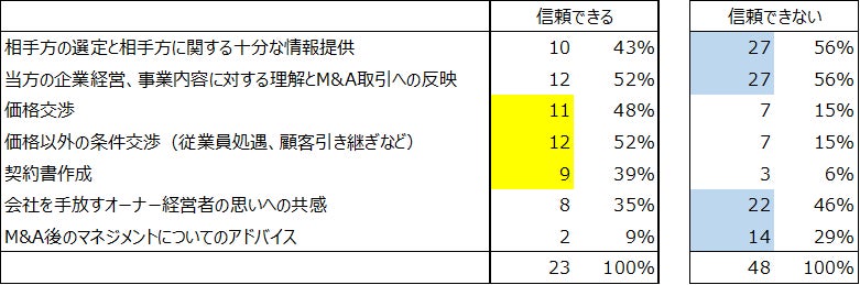 M&Aの専門家としてのハードスキルである価格、条件交渉、契約書作成においては、「信頼できる」が「信頼できない」を上回る回答数を得ているが、「相手先の選定と相手先に関する十分な情報提供」「当方の企業経営、事業内容に対する理解とM&A取引への反映」について「信頼できない」とする回答が非常に多かった。